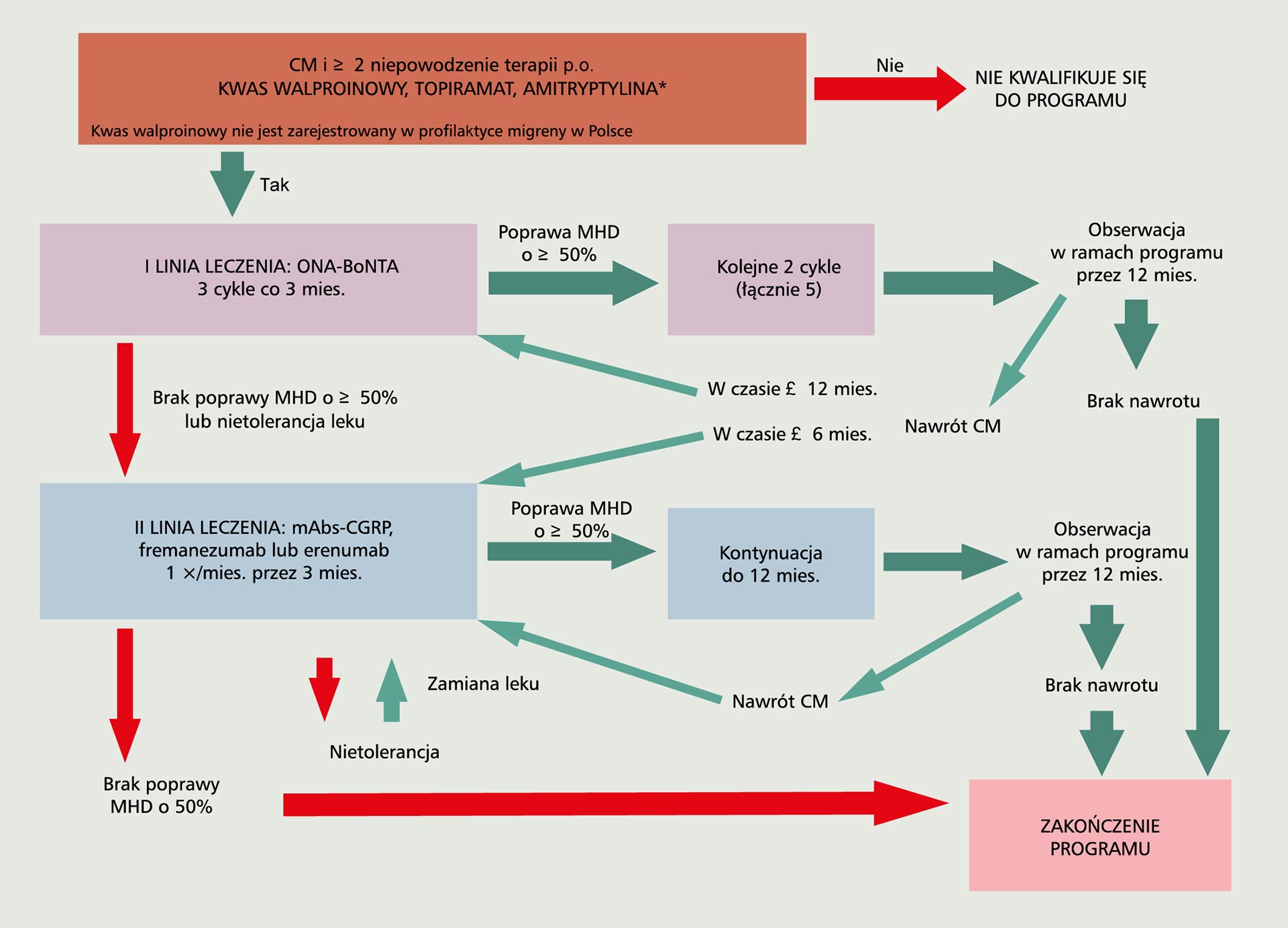 Program lekowy B.133 Narodowego Funduszu Zdrowia; *dawki minimalne: kwas walproinowy 500 mg/d., topiramat 100 mg/d., amitryptylina 50 mg/d.; czas terapii — min. 3 mies.; w przypadku nawrotu zwiększenie o min. 1/3 MHD lub o min. 1/3 MMD, lub o min. 1/3 dni z lekami abortywnymi; pacjent może być ponownie zakwalifikowany do programu tylko jeden raz (opracowała M. Boczarska-Jedynak); CM (chronic migraine) — migrena przewlekła; p.o. (per os) — doustnie; ONA-BoNTA (onabotulinumtoxin A) — toksyna botulinowa typu A.; MHD (monthly headache days) — ogólna średnia zmiana liczby miesięcznych dni z bólem głowy z migreną; MMD (monthly migraine days) — dni z migreną w miesiącu ; mAbs-CGRP (monoclonal antibodies calcitonin gene-related peptide/calcitonin gene-related peptide receptor) — przeciwciała monoklonalne przeciw peptydowi pochodnemu genu kalcytoniny/receptorowi peptydu pochodnego genu kalcytoniny.